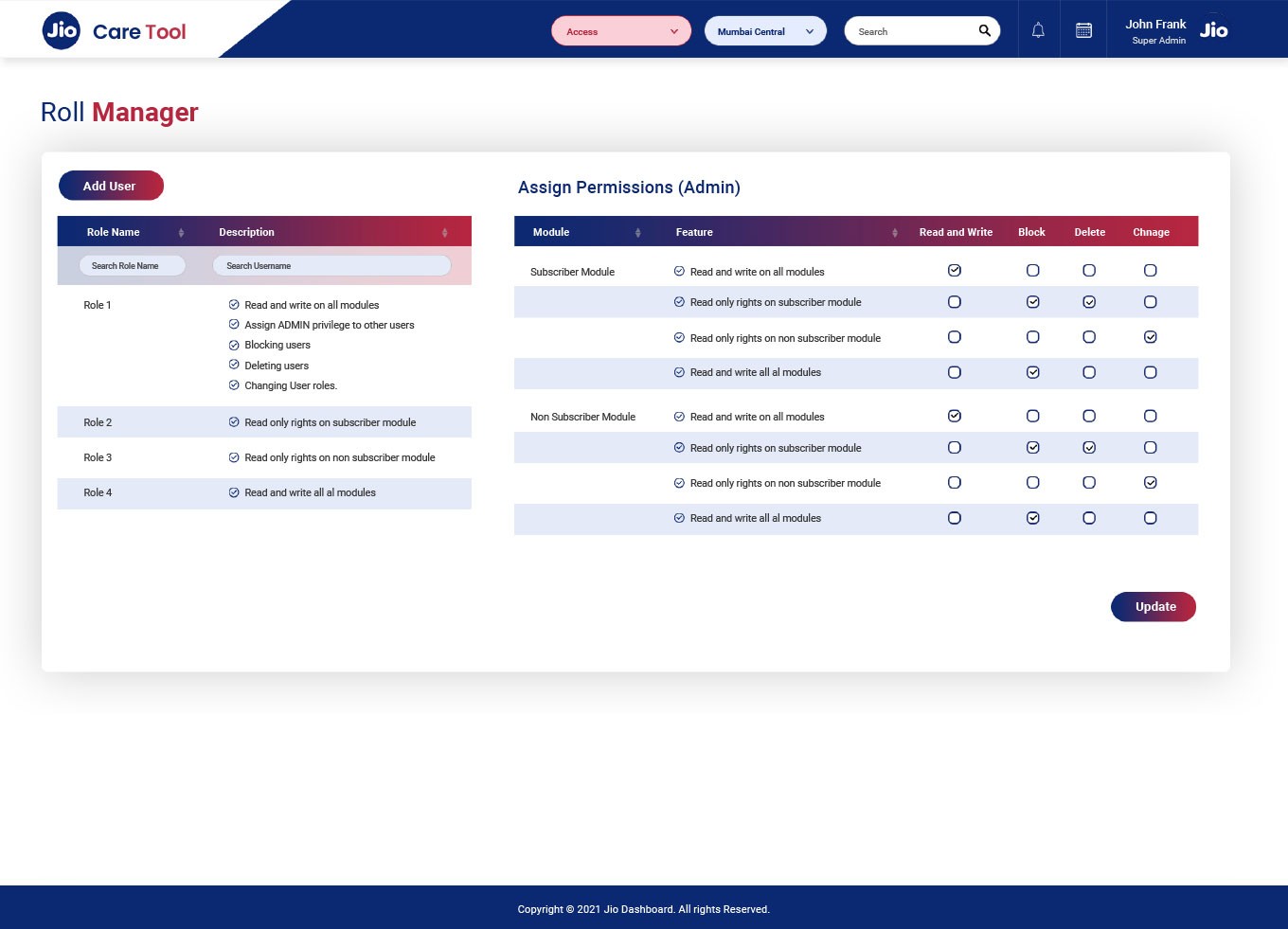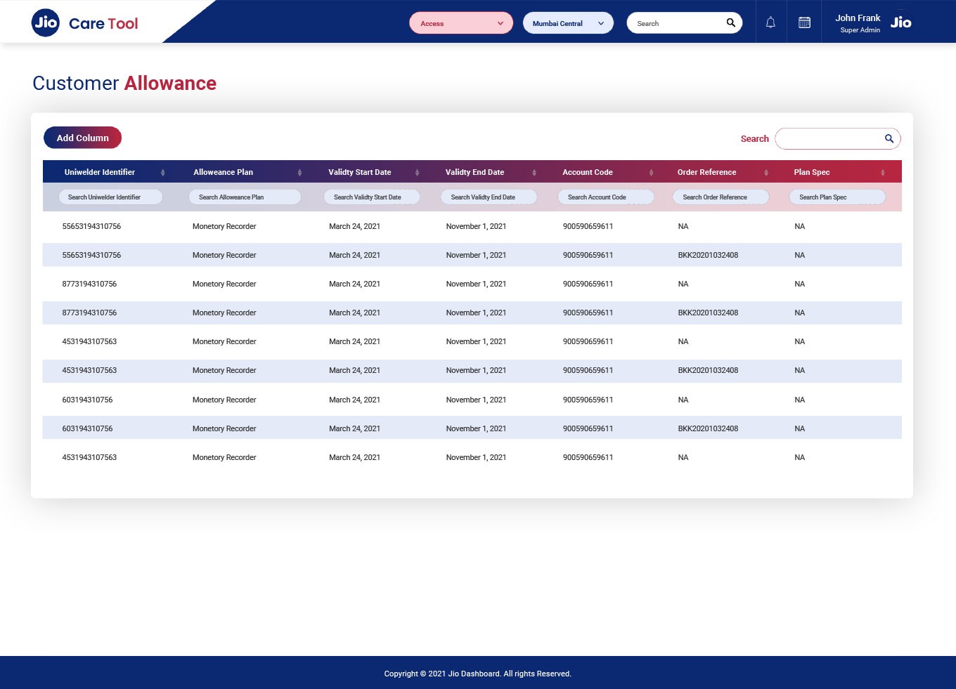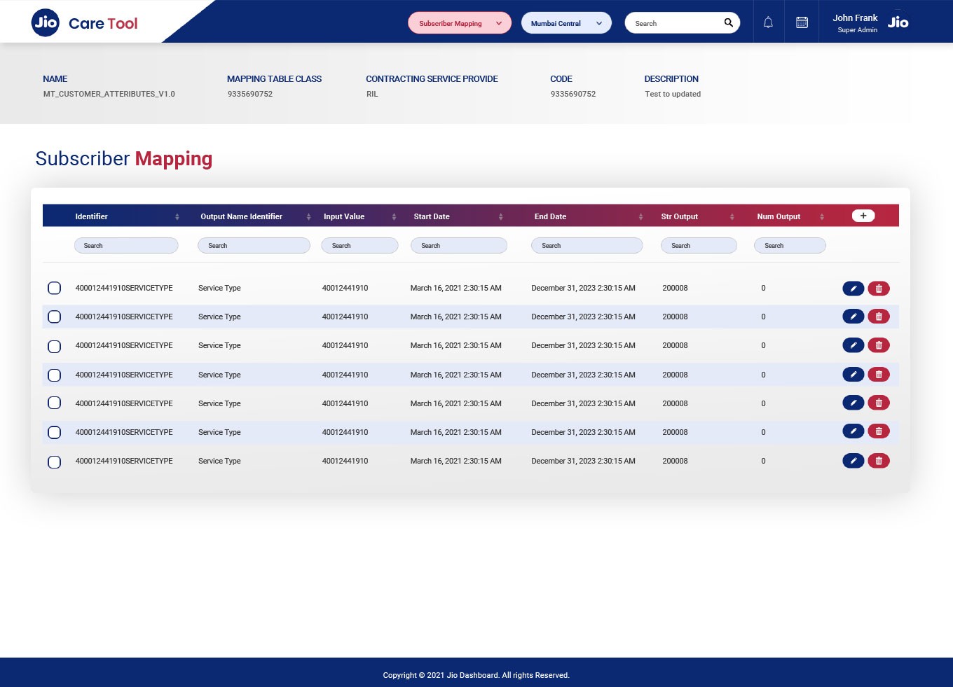 Legacies Techno delivered a web-based centralized operations dashboard, fully built and deployed by its internal team using Angular. Developed in close collaboration with Jio Telecom's senior leadership, the tool provides a unified interface for real-time monitoring and management. Key functionalities include telecom-specific workflows like subscriber management, usage analytics, and pricing control, backed by robust CRUD operations. Designed with scalability in mind, it supports seamless deployment across Jio’s multiple nationwide data centers.